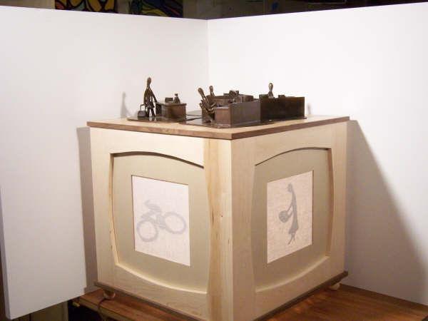 "Jeux Sans Frontieres" for Movers and Shakers - Portrait show-Staff of the North County Times. Collaboration of writers and editors portrayed by a collaboration of artists. Bronze sculptures of work life by DCGhilarducci. Base (portrayal of personal life): Maple and Walnut, 30x30x30. Shadows cast by dimmed light..
