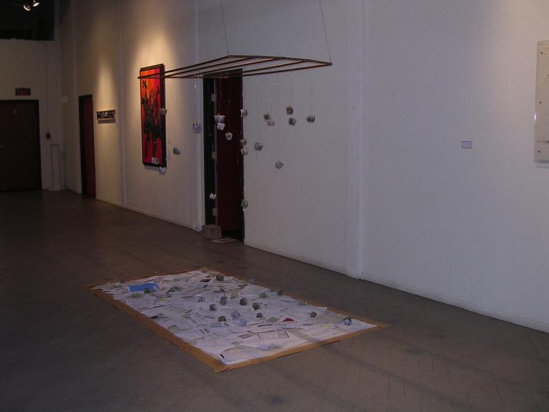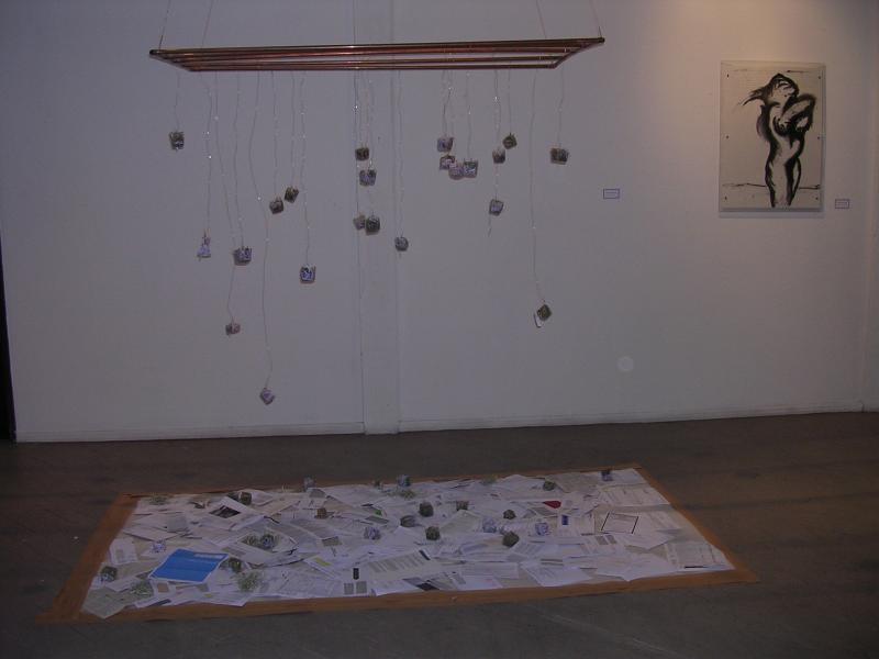 "It's Only Money"- Installation dealing with the senslessness of worry. Shredded tax forms and U.S. currency suspended in gelatin cubes hanging from copper tubing over tossed tax forms and instructions. .