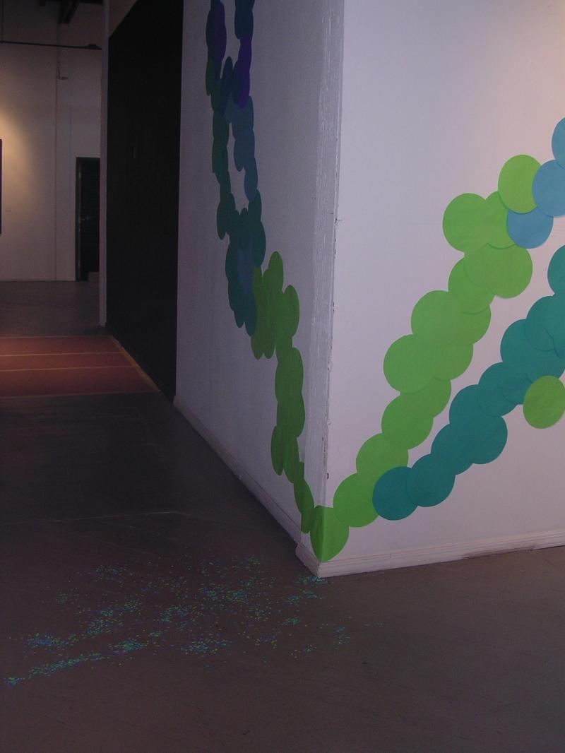 "It's a Full Moon, Tyke"-Installation dealing with emptiness and loss. Paper and reusable glue on walls and floor.