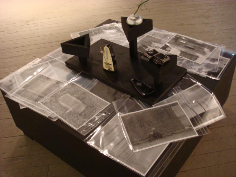 "Time doesn't slow or stop" Exploration of past, present and future for show "Tempus Fugit". Wood, black clay, photos of cemetery headstones and tombstones, lighted tree, metronome. Size varies.